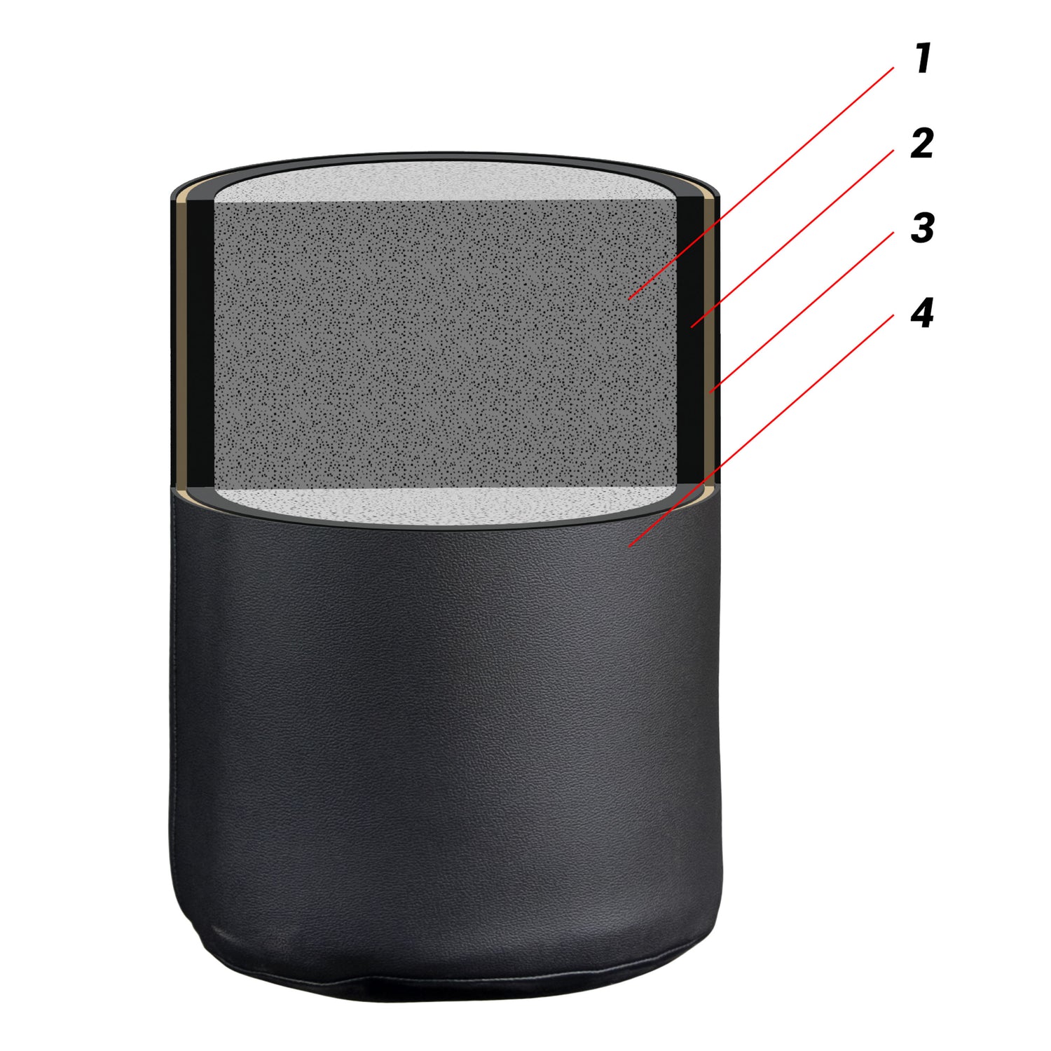 1. syntetická kůže, 2. PUR pěna, 3. měkčená vrstva pěny, 4. látková střiž s PUR pěnou