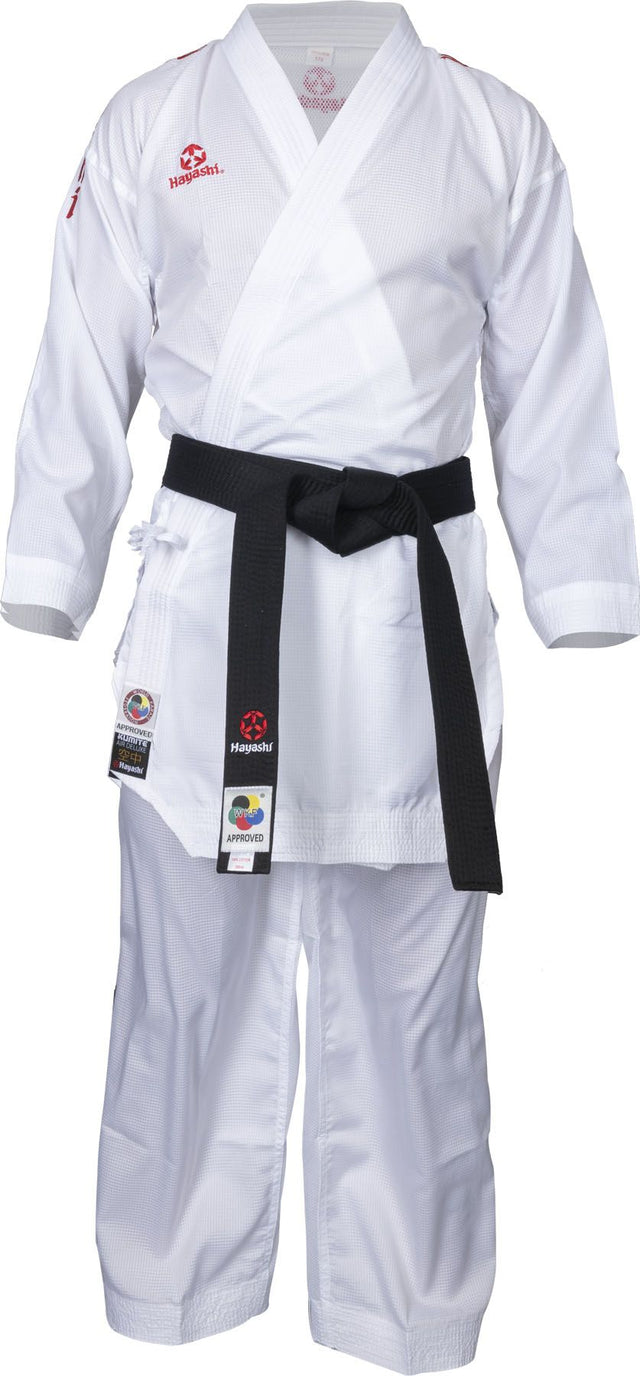 „Air Deluxe“ Hayashi Karate Kumite-Gi je nejlehčí kimono na trhu. Kombinace unikátní struktury tkaniny a prodyšné látky mesh šetří váhu kimona, ale také činí karete-gi extrémně odolným. Vršek i kalhoty Vás přesvědčí svým dokonalým střihem. Při výrobě byl také byl kladen velký důraz na švy a šití, takže provedení je velice precizní.