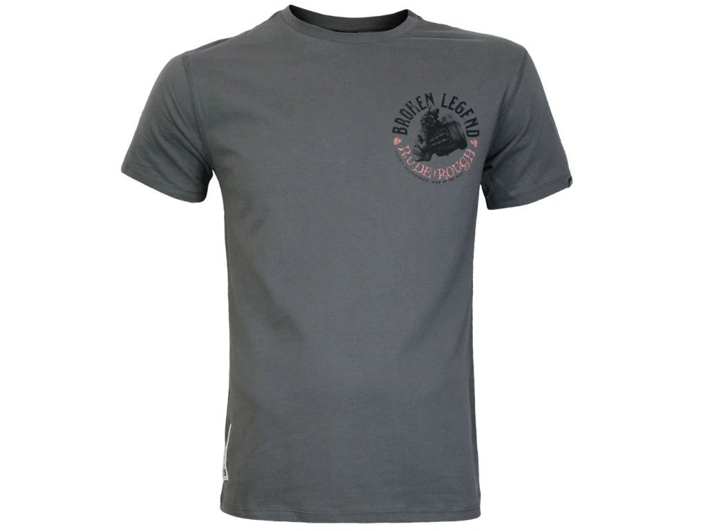 Na přední straně je menší motiv se sloganem Broken Legend a ikonickým dvoumotorovým designem. Zadní stranu zdobí výrazný potisk BROKEN LEGEND v horní části a nápis Hollywood Hellracer ve spodním oblouku. Uprostřed dominuje grafika dvou lebek propojených motorovými bloky, symbolizující energii, rychlost a drsný streetový styl.
