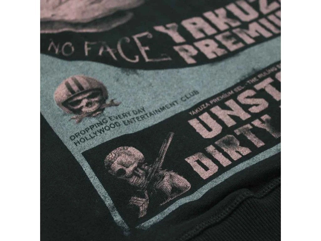 Přední strana působí střídmě díky menšímu motivu lebky na hrudi. Zadní strana je výrazná a nepřehlédnutelná – dominuje jí masivní grafický potisk s textem NO FACE NO CASE – PART 28, doplněný lebkou, symboly a sloganem UNSTOPPABLE DIRTY MONEY CREW. Design nese typickou temnou, rebelský street estetiku značky. Regular fit střih je lehce přiléhavý, při váhání mezi velikostmi se doporučuje zvolit větší.