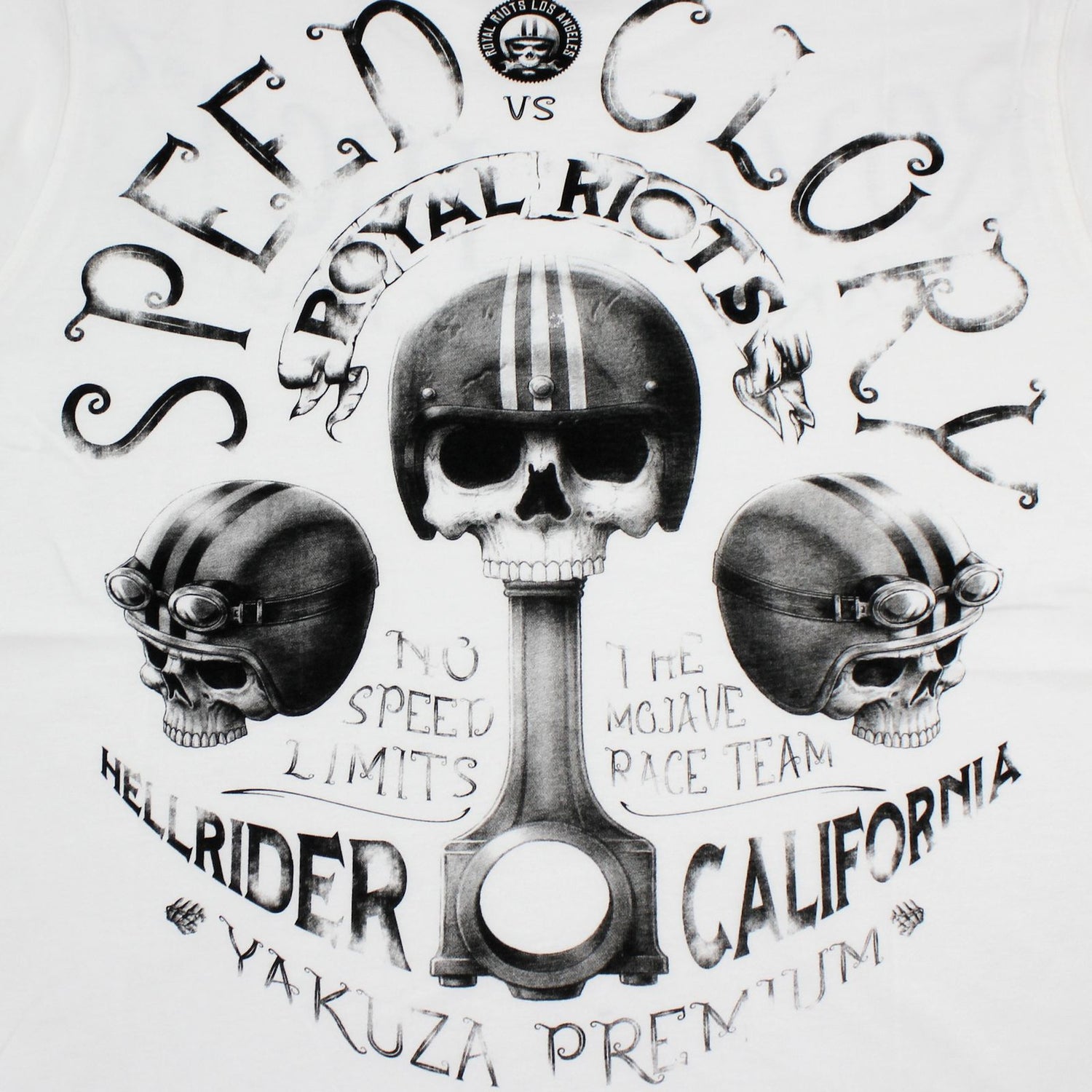 - Potisk s nápisem na hrudi, výrazný motiv lebky na zádech