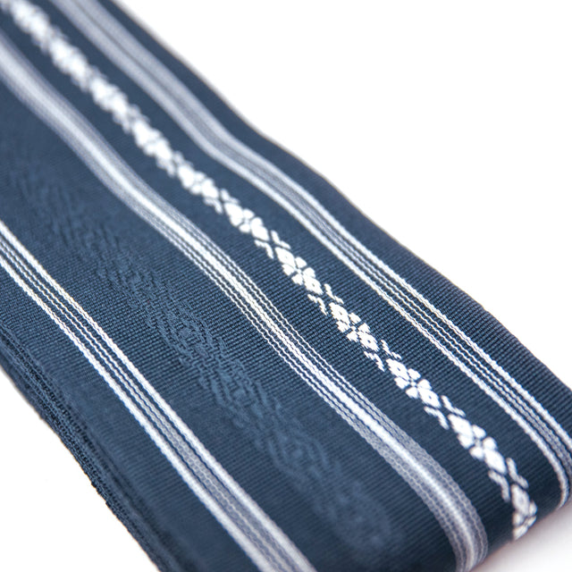 Tento luxusní Kaku Obi je vynikajícím příkladem tradičního japonského pásu v širším provedení. Díky trubkovému způsobu tkaní nemá zpevněnou střední část, a proto má po celé délce rovnoměrnou tloušťku.