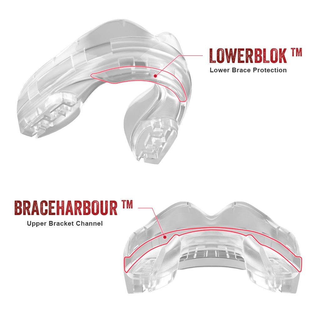 Představujeme řadu Ortho Series, nejpokročilejší ortodontický chránič na trhu. Chránič zubů nabízí plný ochranný kryt rovnátek s ochrannou známkou BRACE HARBOUR™, ale také integruje LOWERBLOK™, který pomáhá chránit rty a vnitřní tvář.